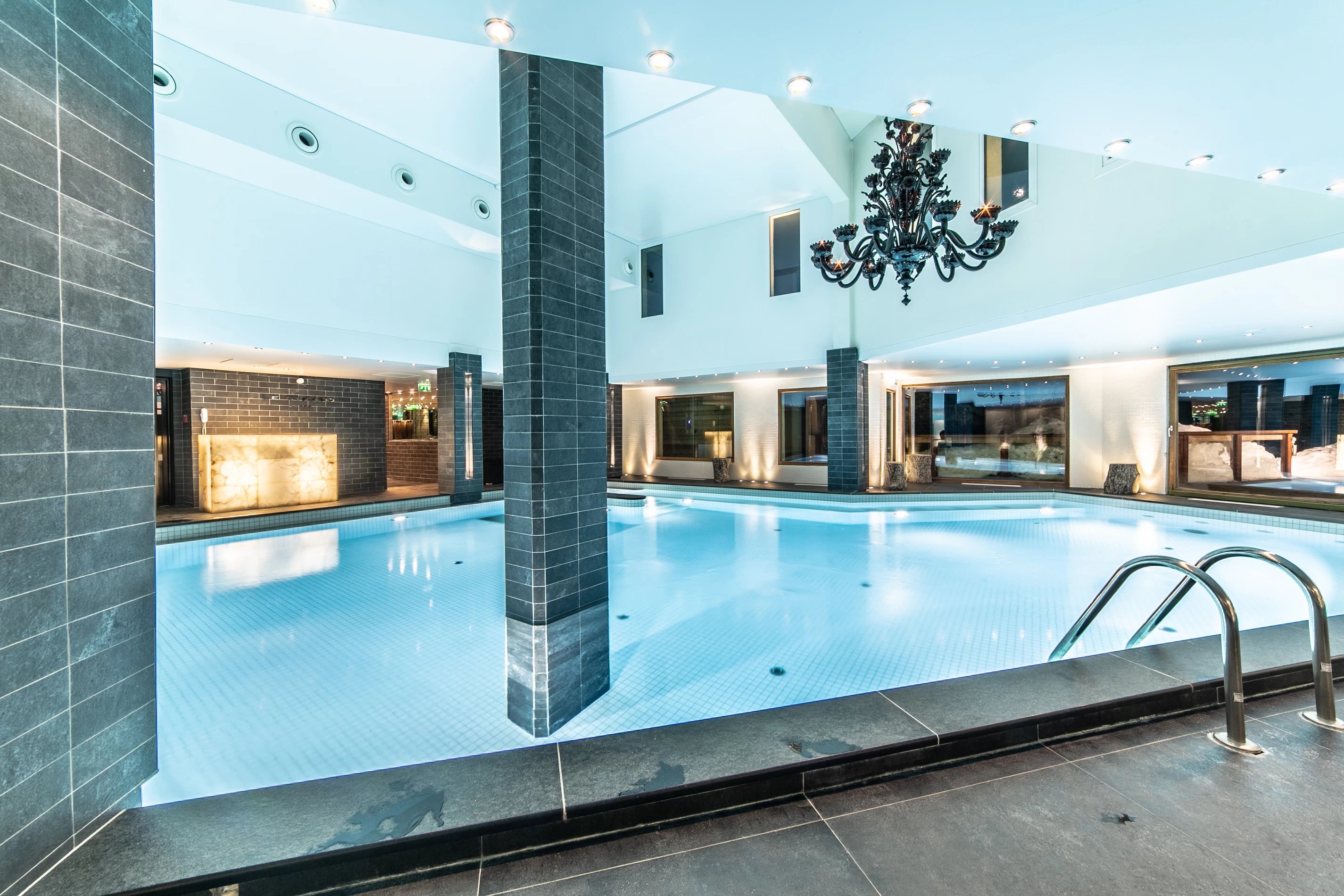 L’espace fitness, équipé des dernières technologies, complète idéalement les installations pour les amateurs de sport et de remise en forme. Après une séance, prolongez votre détente dans la piscine intérieure, véritable signature d’un hôtel avec piscine à Courchevel au prestige affirmé.