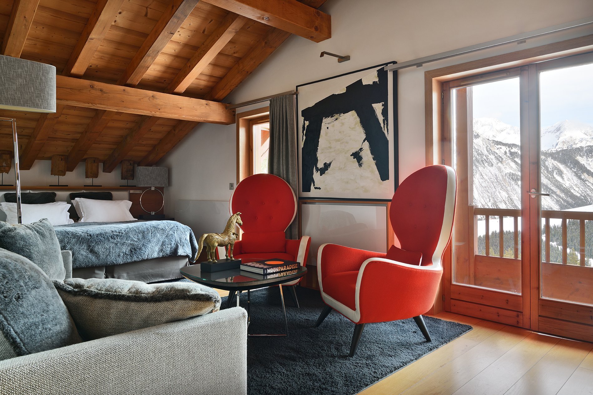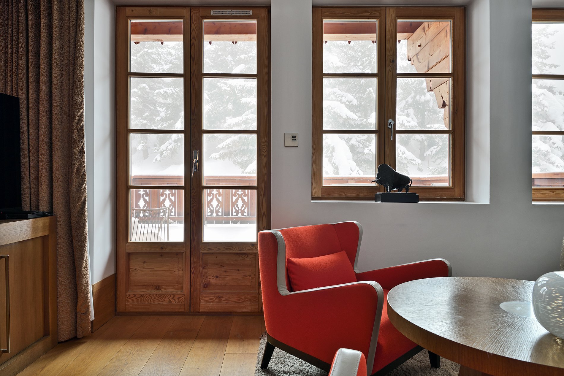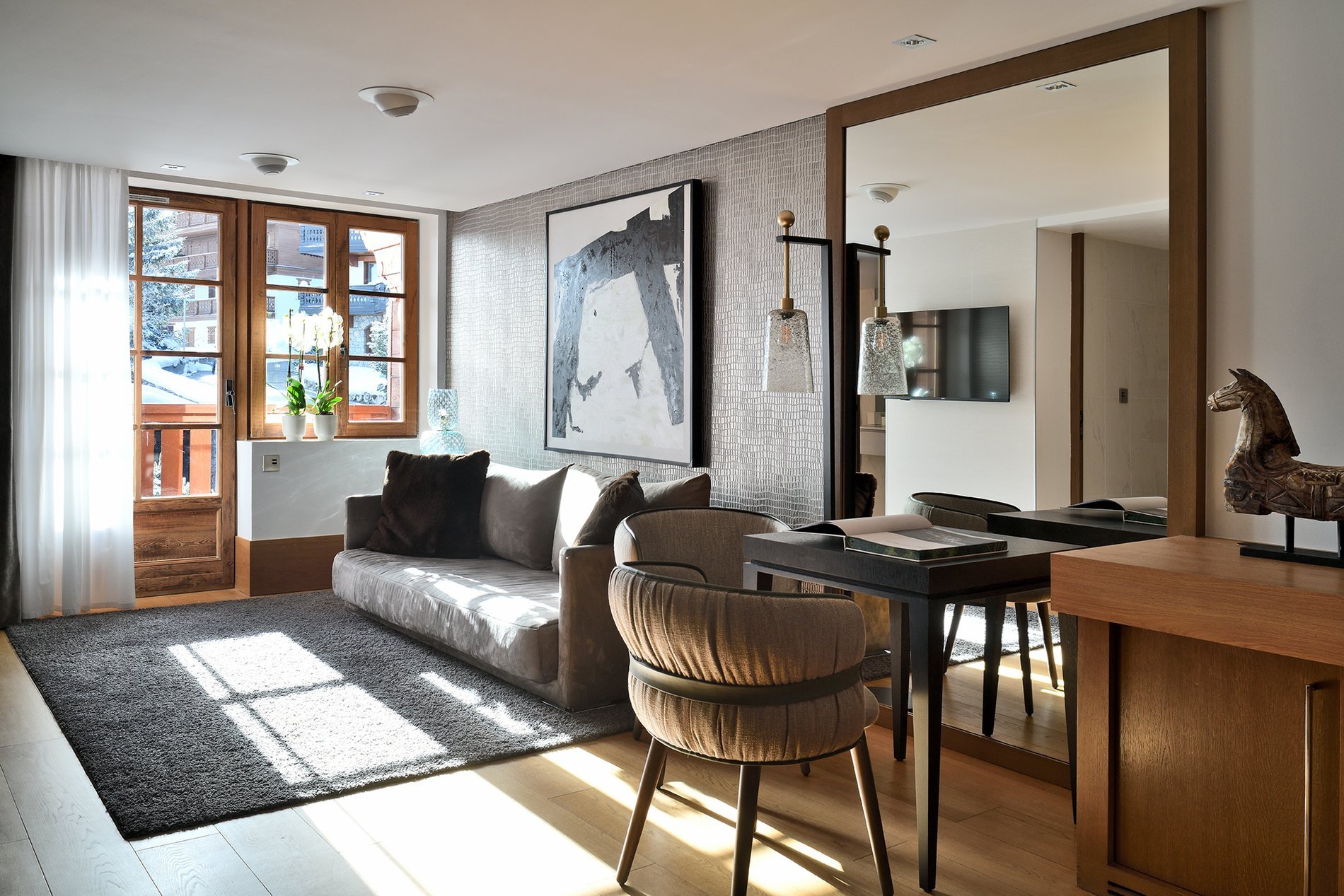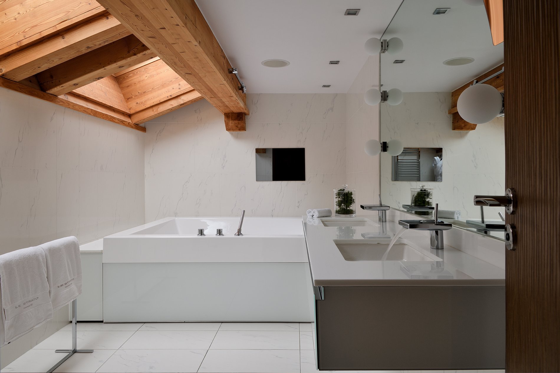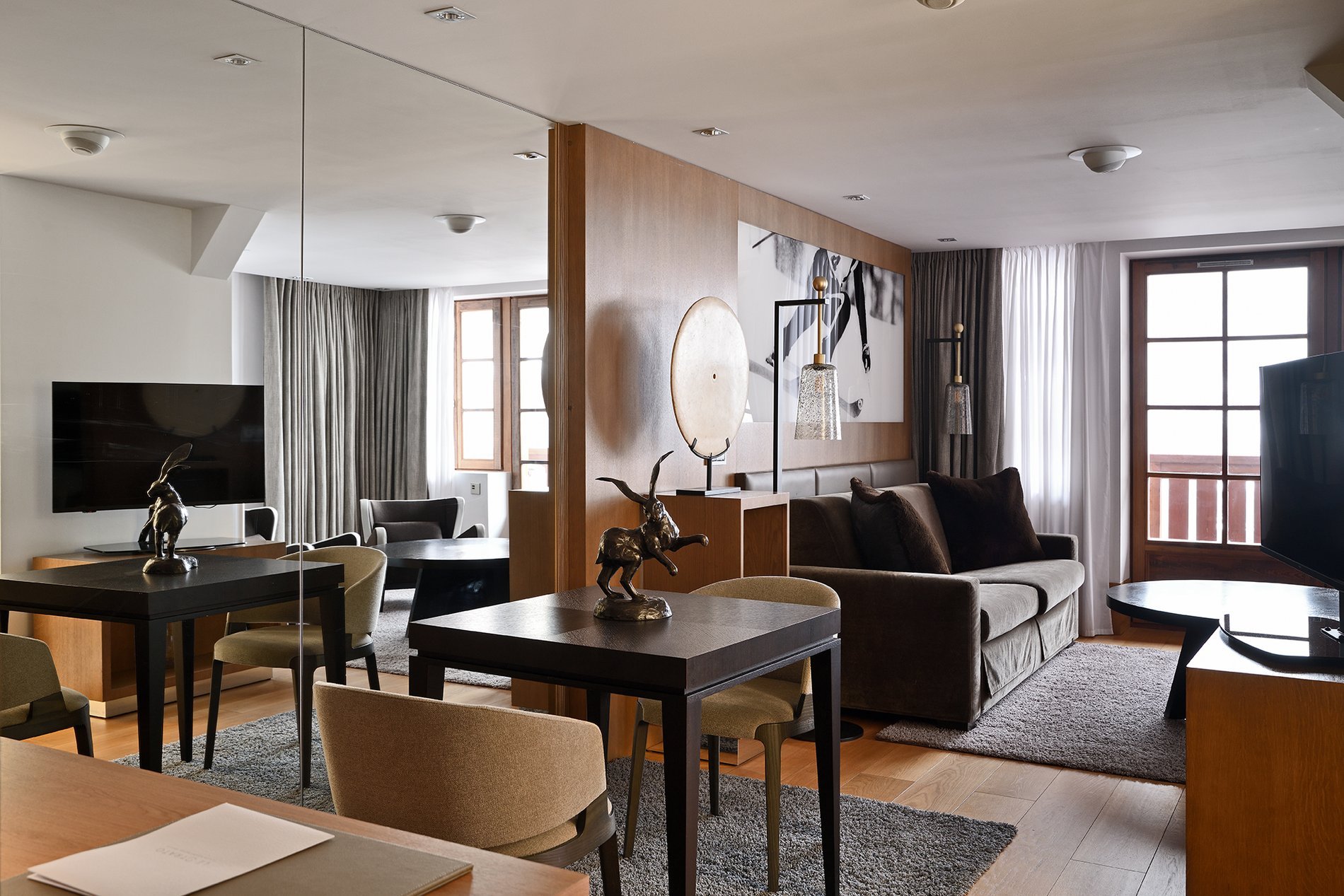 Уровень 0: Гостиная зона с 1 диванами-кроватями и телевизором / Гардеробная / Ванная комната с ванной, итальянским душем и телевизором, двойной раковиной / Отдельный туалет / Балкон с видом на вход в отель и горы. Уровень +1: Спальня с кроватью King-size и телевизором / Гардеробная /Гостиная зона/ Ванная комната с ванной формата XL и телевизором / Балкон с видом на горы