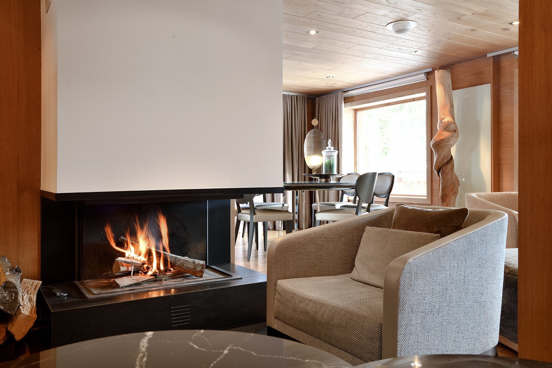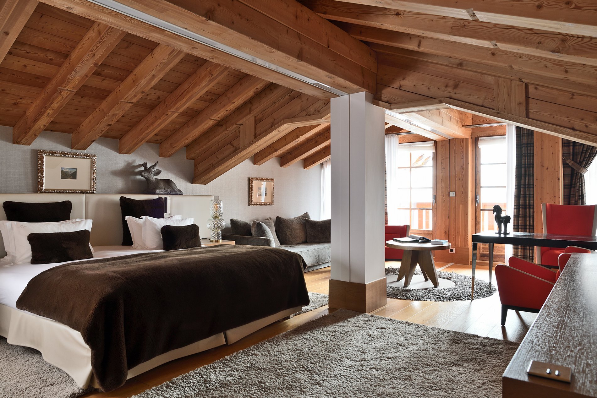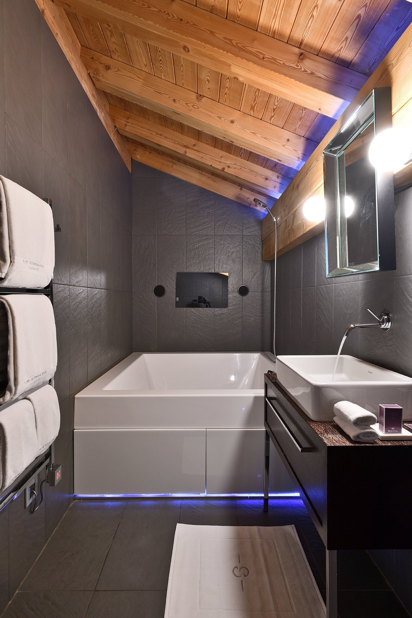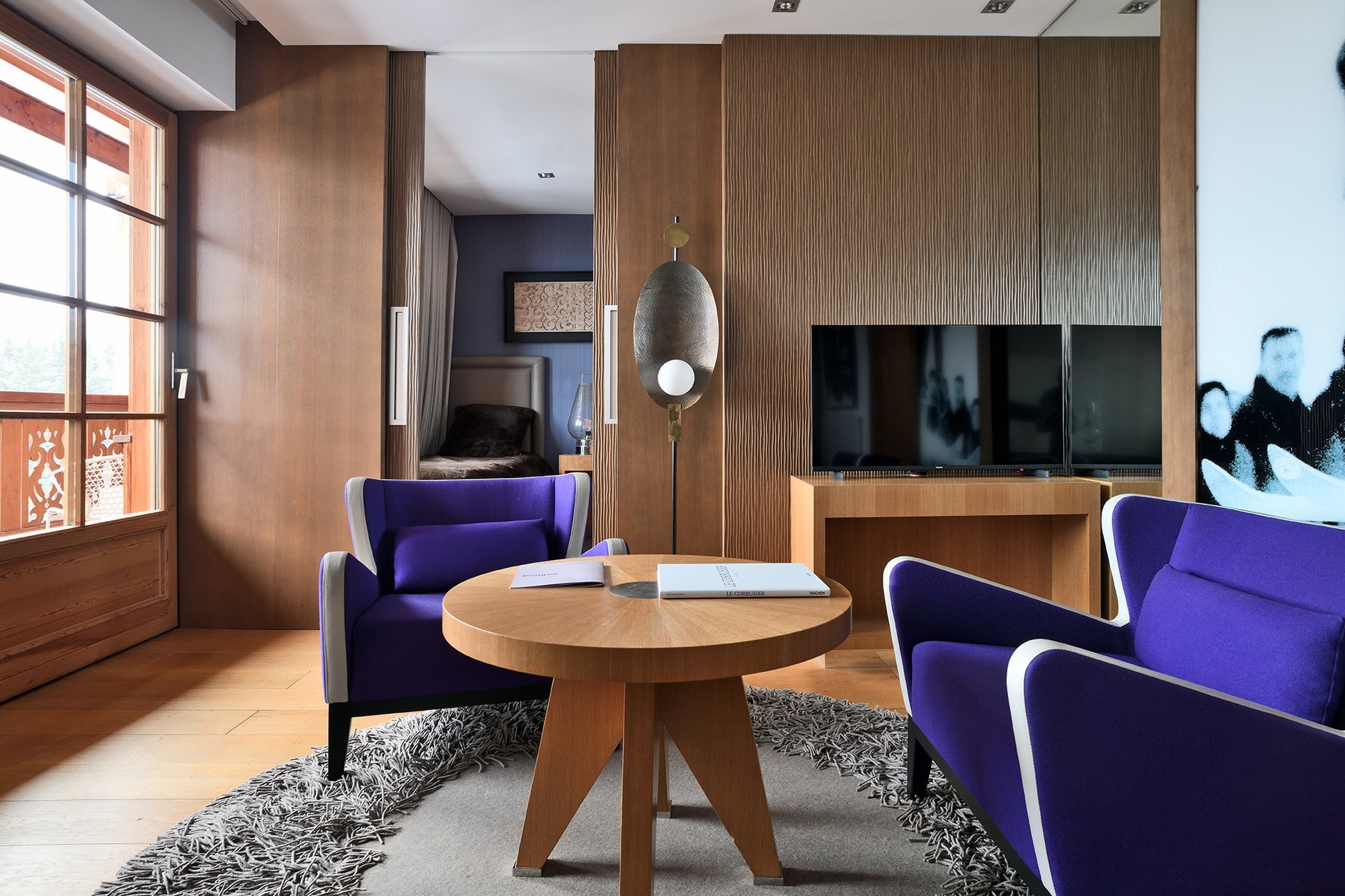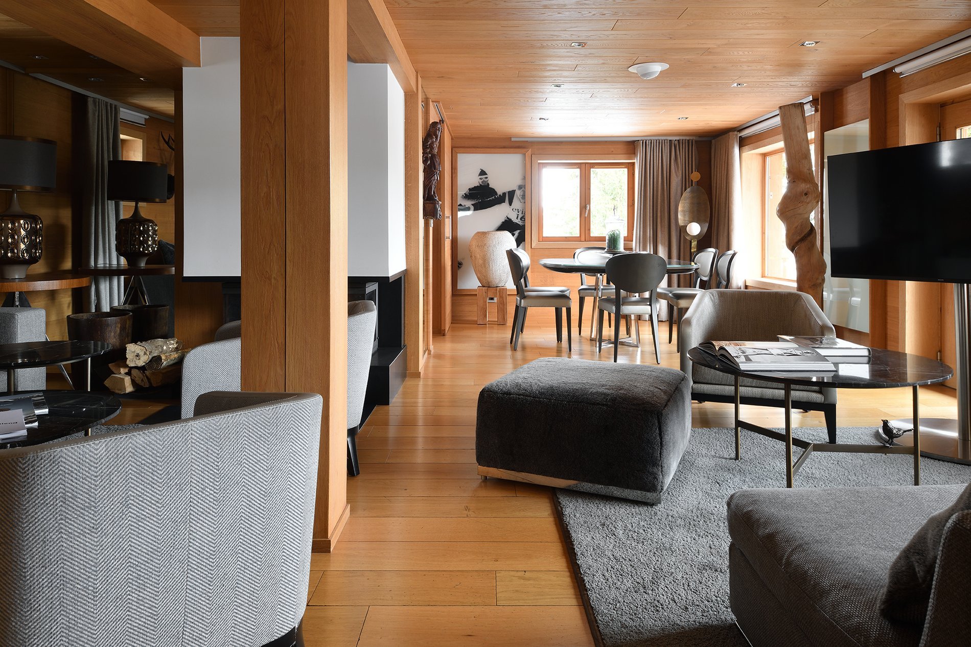 Уровень 0: Гостиная зона с 1 диванами-кроватями и телевизором / Гардеробная / Ванная комната с ванной, итальянским душем и телевизором, двойной раковиной / Отдельный туалет / Балкон с видом на вход в отель и горы. Уровень +1: Спальня с кроватью King-size и телевизором / Гардеробная /Гостиная зона/ Ванная комната с ванной формата XL и телевизором / Балкон с видом на горы