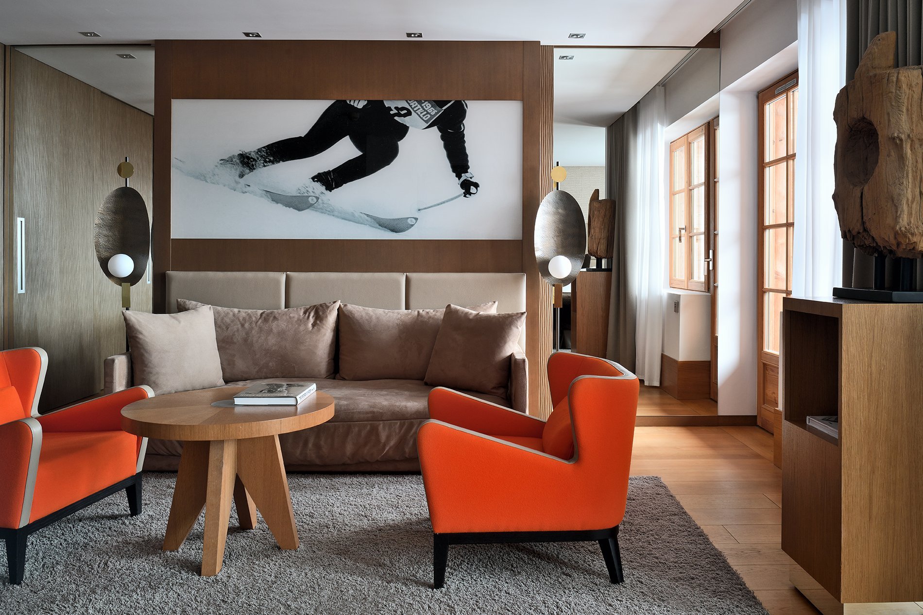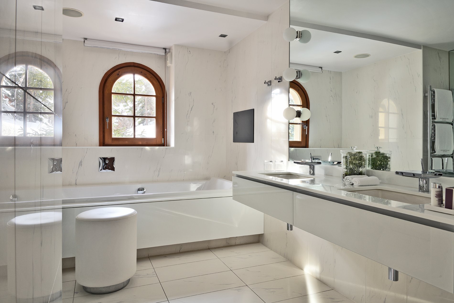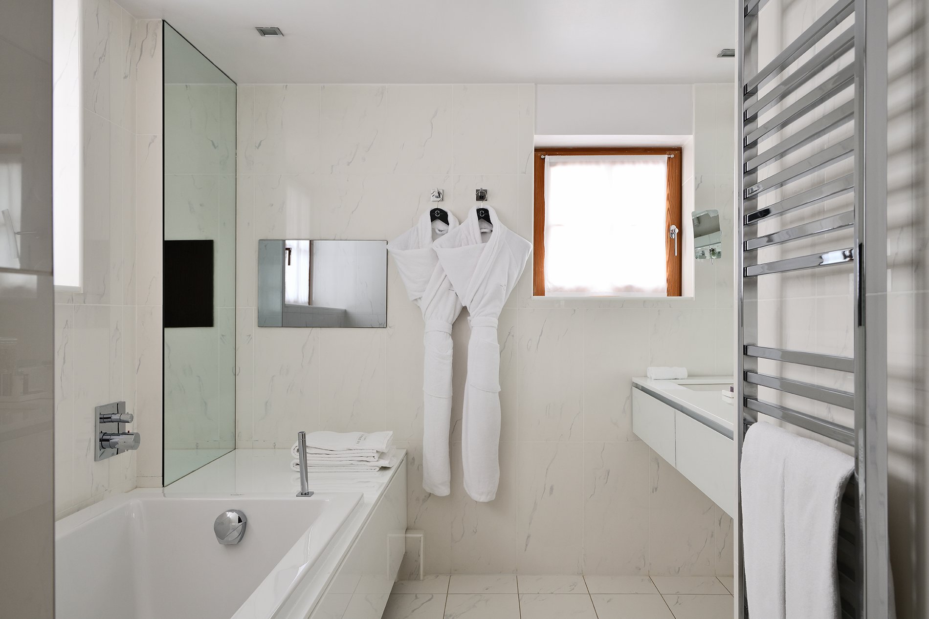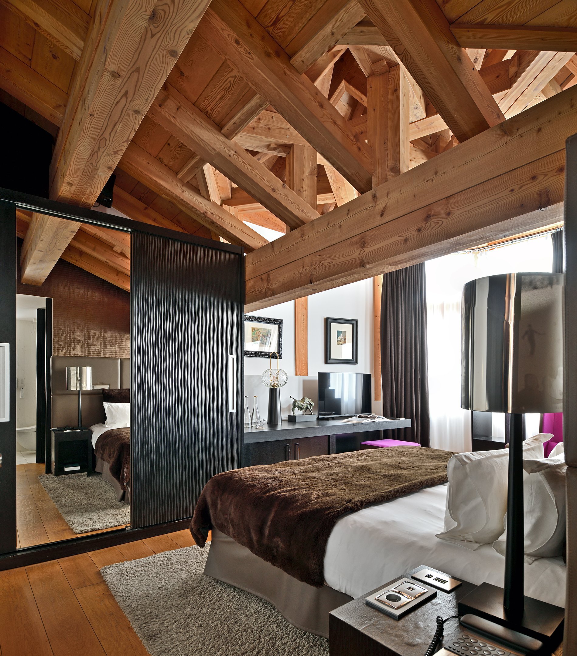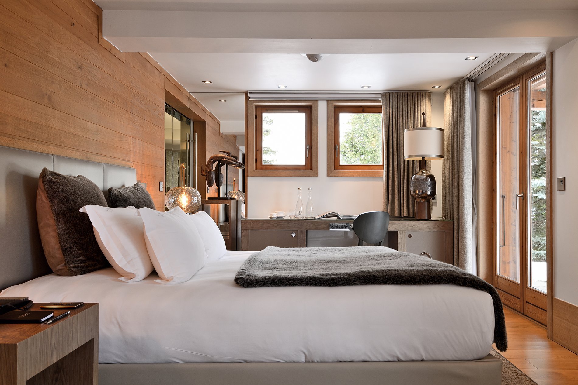 Уровень 0: Гостиная зона с 1 диванами-кроватями и телевизором / Гардеробная / Ванная комната с ванной, итальянским душем и телевизором, двойной раковиной / Отдельный туалет / Балкон с видом на вход в отель и горы. Уровень +1: Спальня с кроватью King-size и телевизором / Гардеробная /Гостиная зона/ Ванная комната с ванной формата XL и телевизором / Балкон с видом на горы