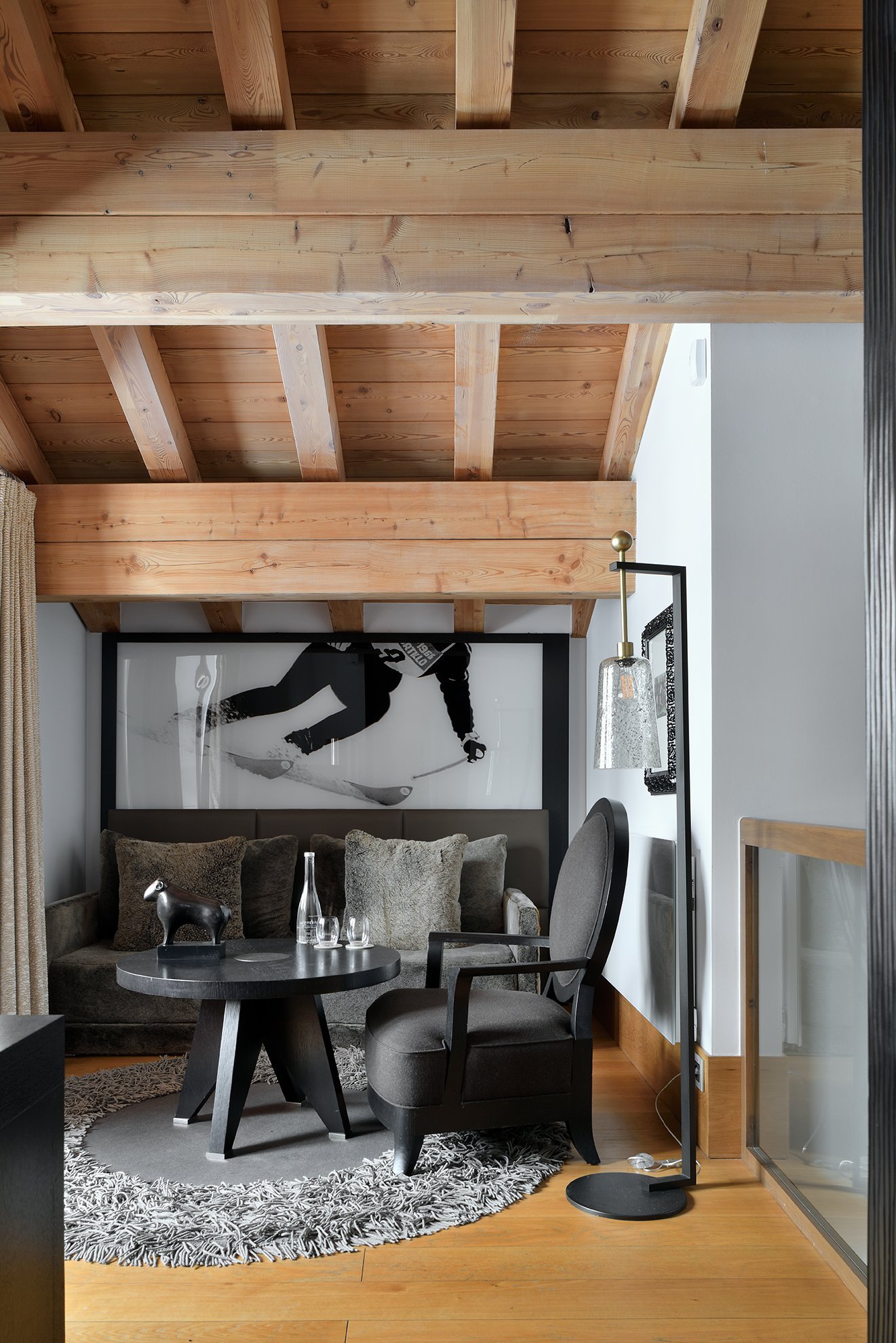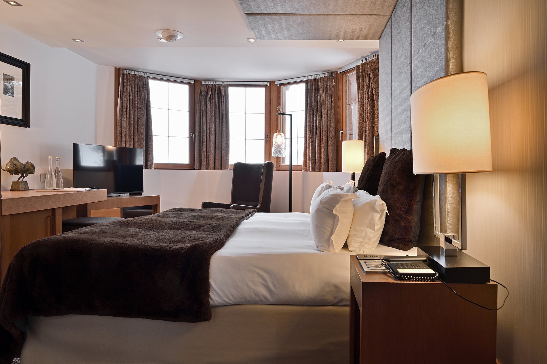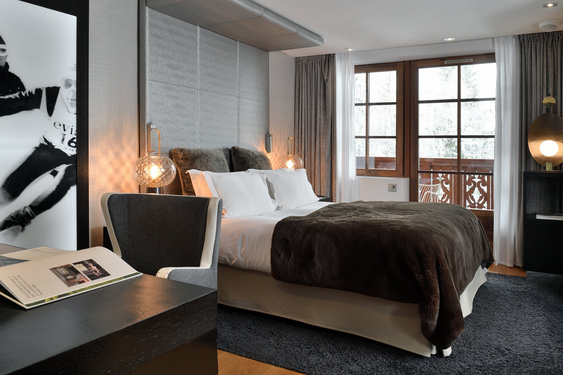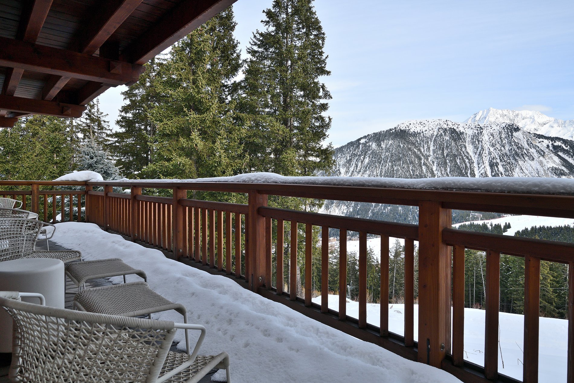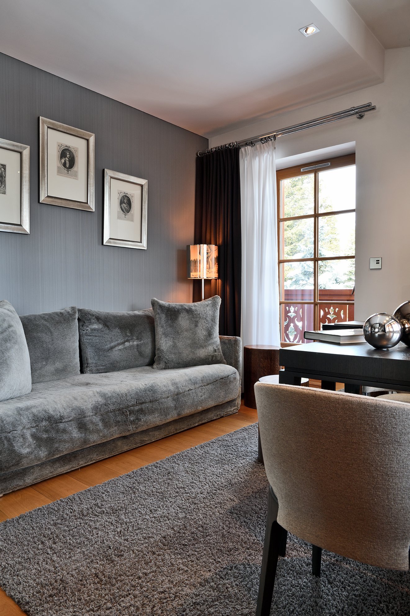 Уровень 0: Гостиная зона с 1 диванами-кроватями и телевизором / Гардеробная / Ванная комната с ванной, итальянским душем и телевизором, двойной раковиной / Отдельный туалет / Балкон с видом на вход в отель и горы. Уровень +1: Спальня с кроватью King-size и телевизором / Гардеробная /Гостиная зона/ Ванная комната с ванной формата XL и телевизором / Балкон с видом на горы
