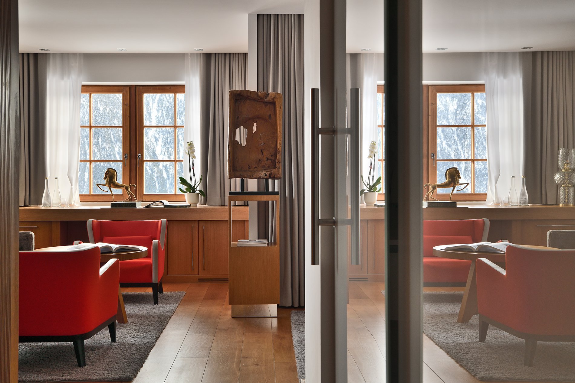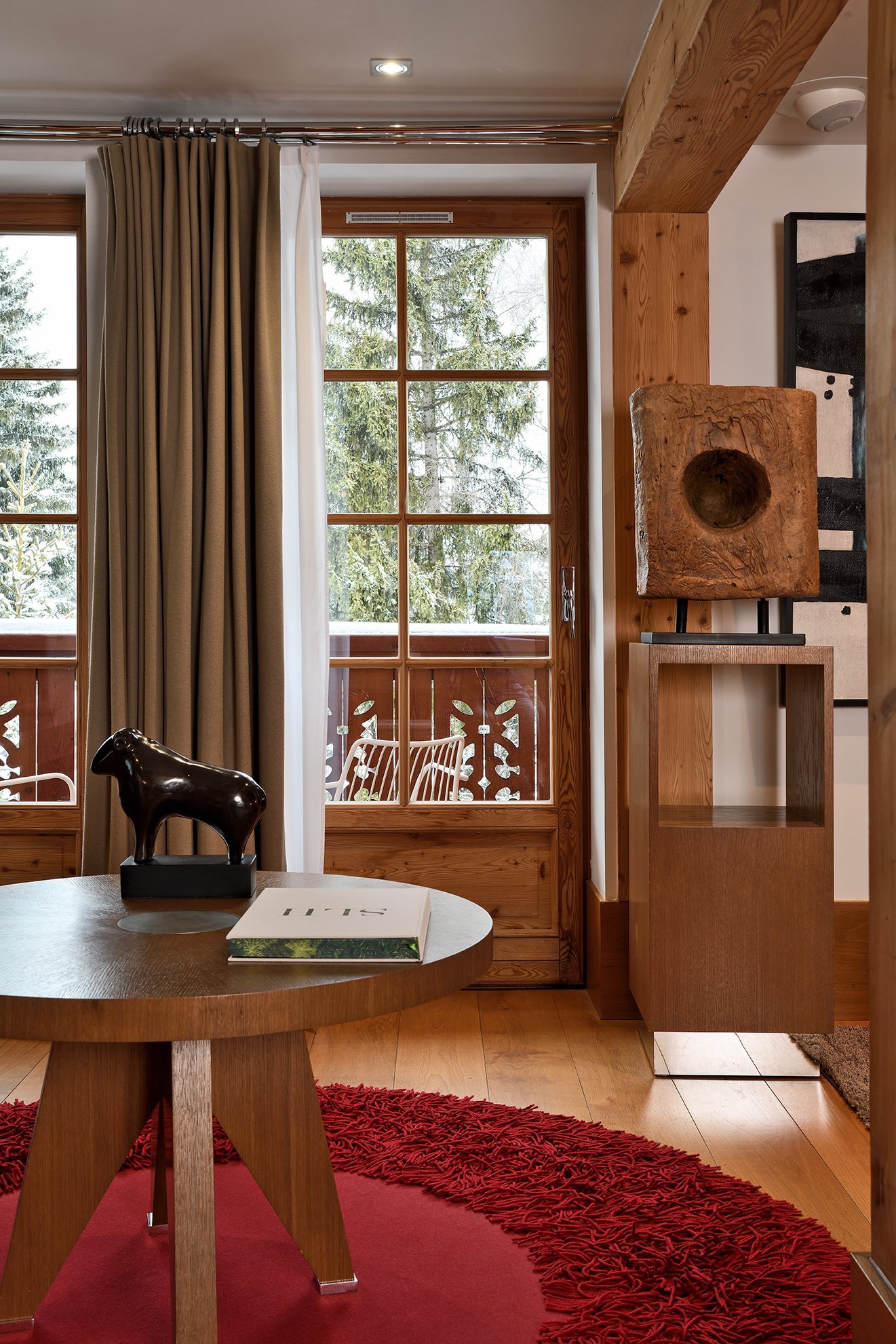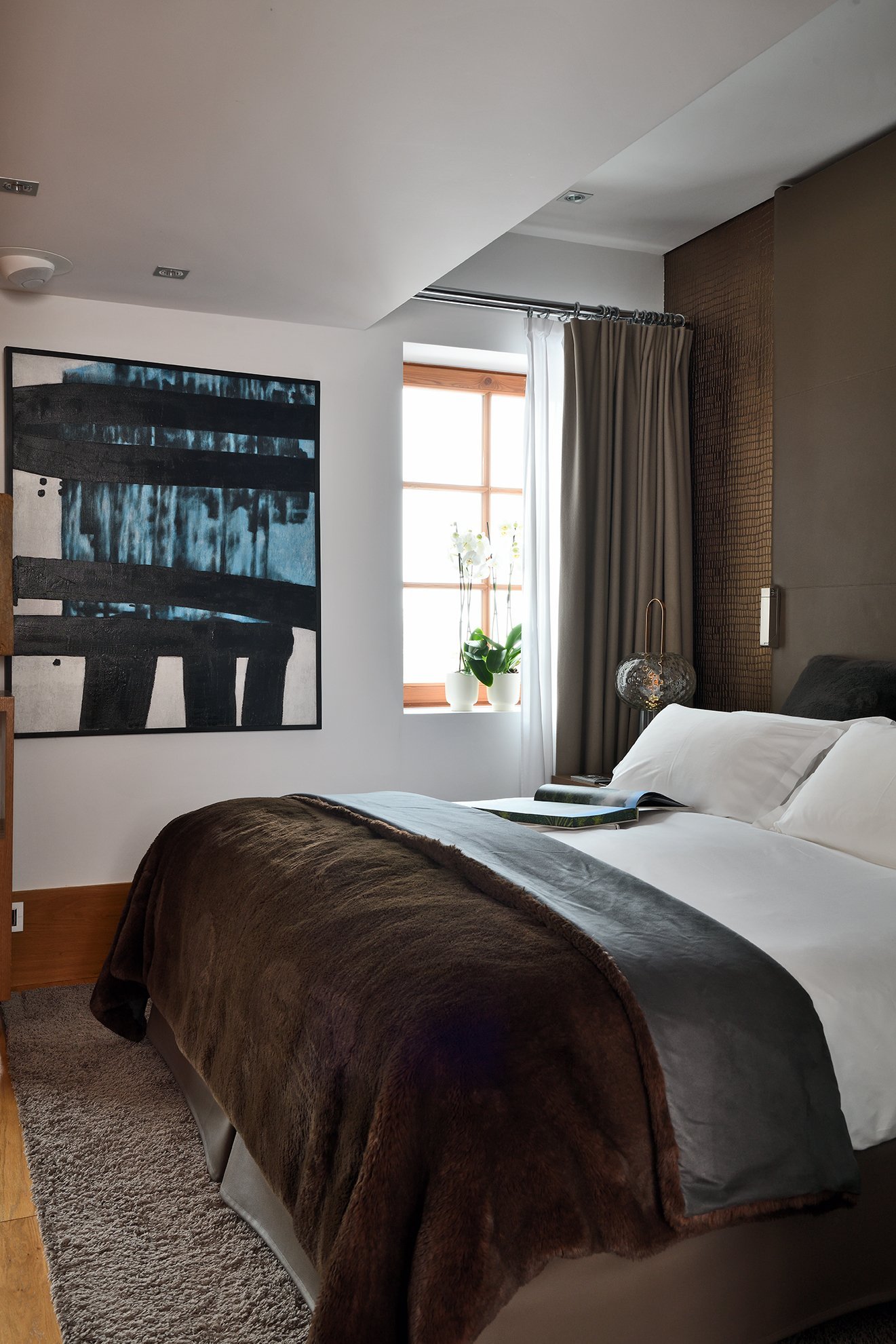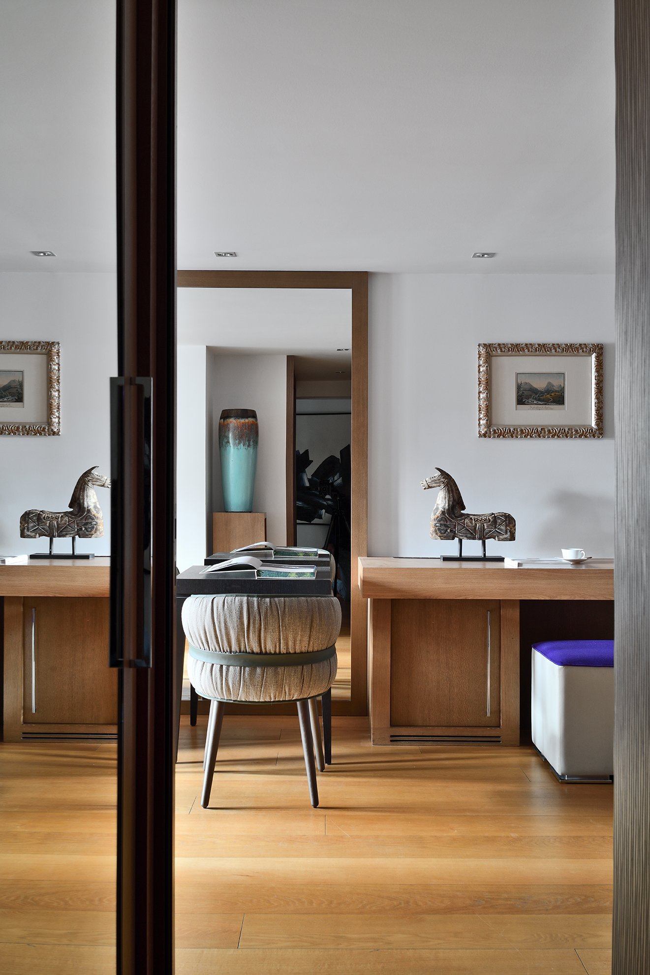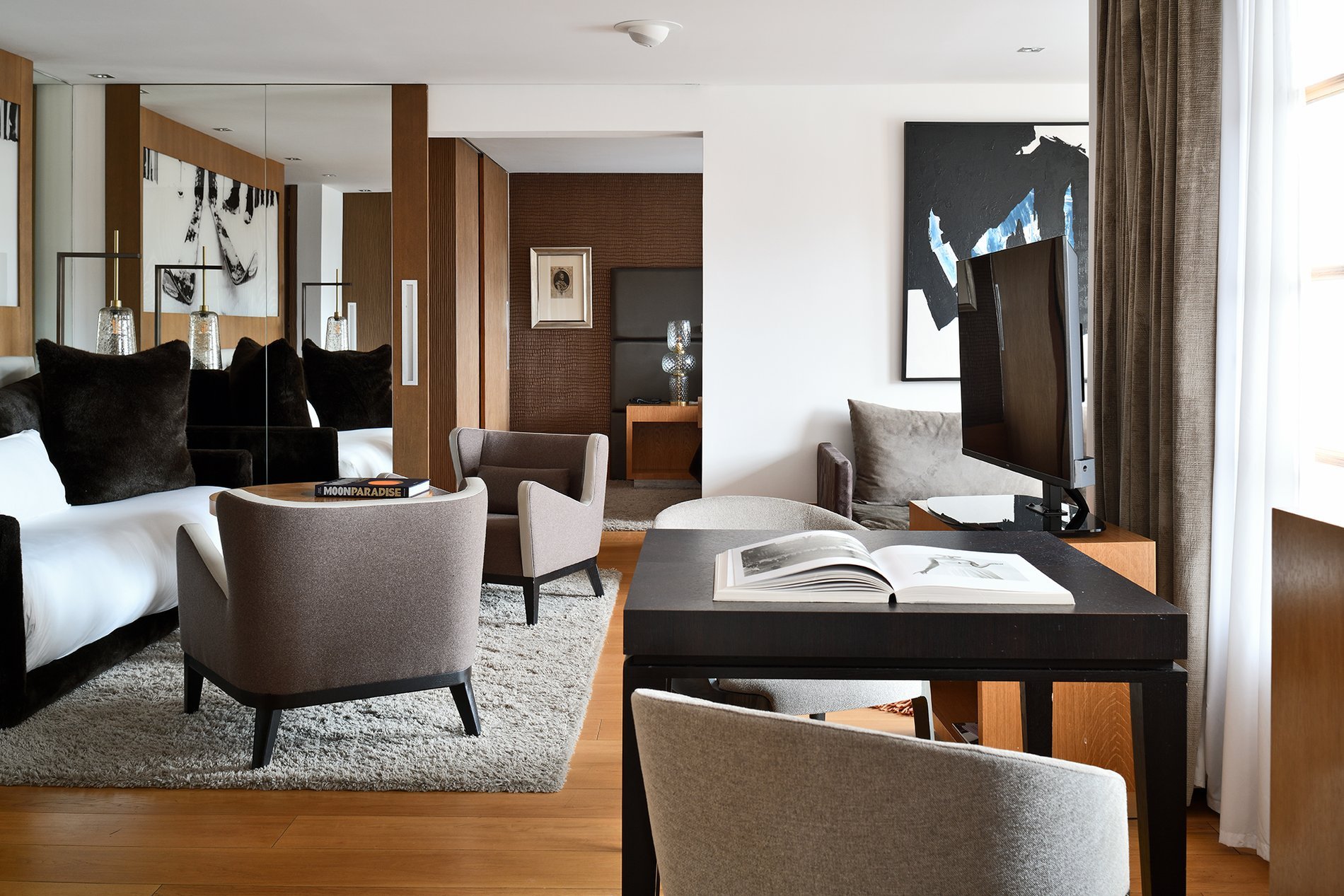 Уровень 0: Гостиная зона с 1 диванами-кроватями и телевизором / Гардеробная / Ванная комната с ванной, итальянским душем и телевизором, двойной раковиной / Отдельный туалет / Балкон с видом на вход в отель и горы. Уровень +1: Спальня с кроватью King-size и телевизором / Гардеробная /Гостиная зона/ Ванная комната с ванной формата XL и телевизором / Балкон с видом на горы